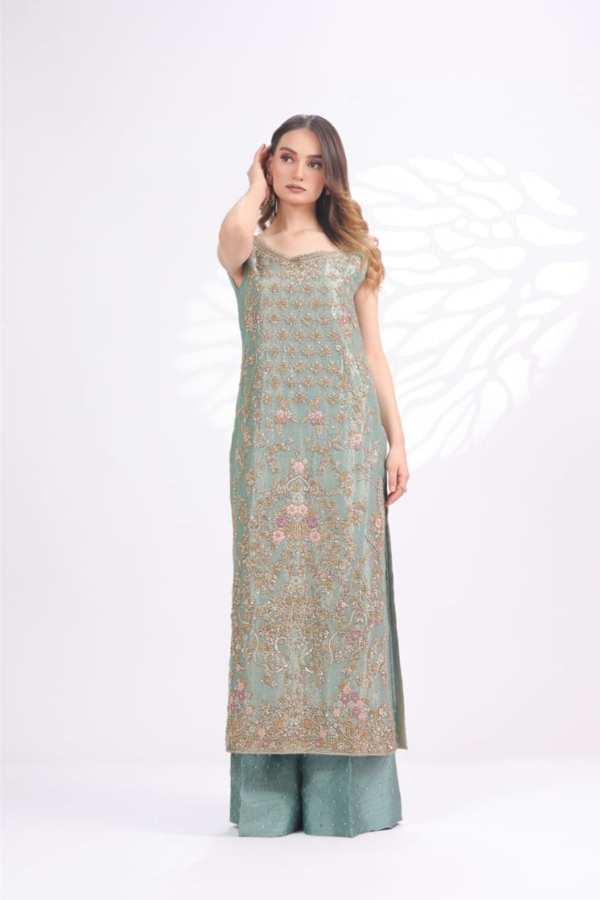 The Ariya Seafoam Embroidered Set is a graceful expression of pastel elegance and fine craftsmanship. Rendered in a soothing seafoam green tone, the long sleeveless silhouette is adorned with intricate gold embroidery accented with subtle blush details, creating a delicate floral narrative across the front panel. The refined neckline and detailed hem add polish, while the matching wide-leg trousers, finished with soft embellishment, complete the look seamlessly. Perfect for daytime festivities, formal luncheons, or intimate celebrations, Ariya Seafoam offers understated luxury with a fresh, modern charm.