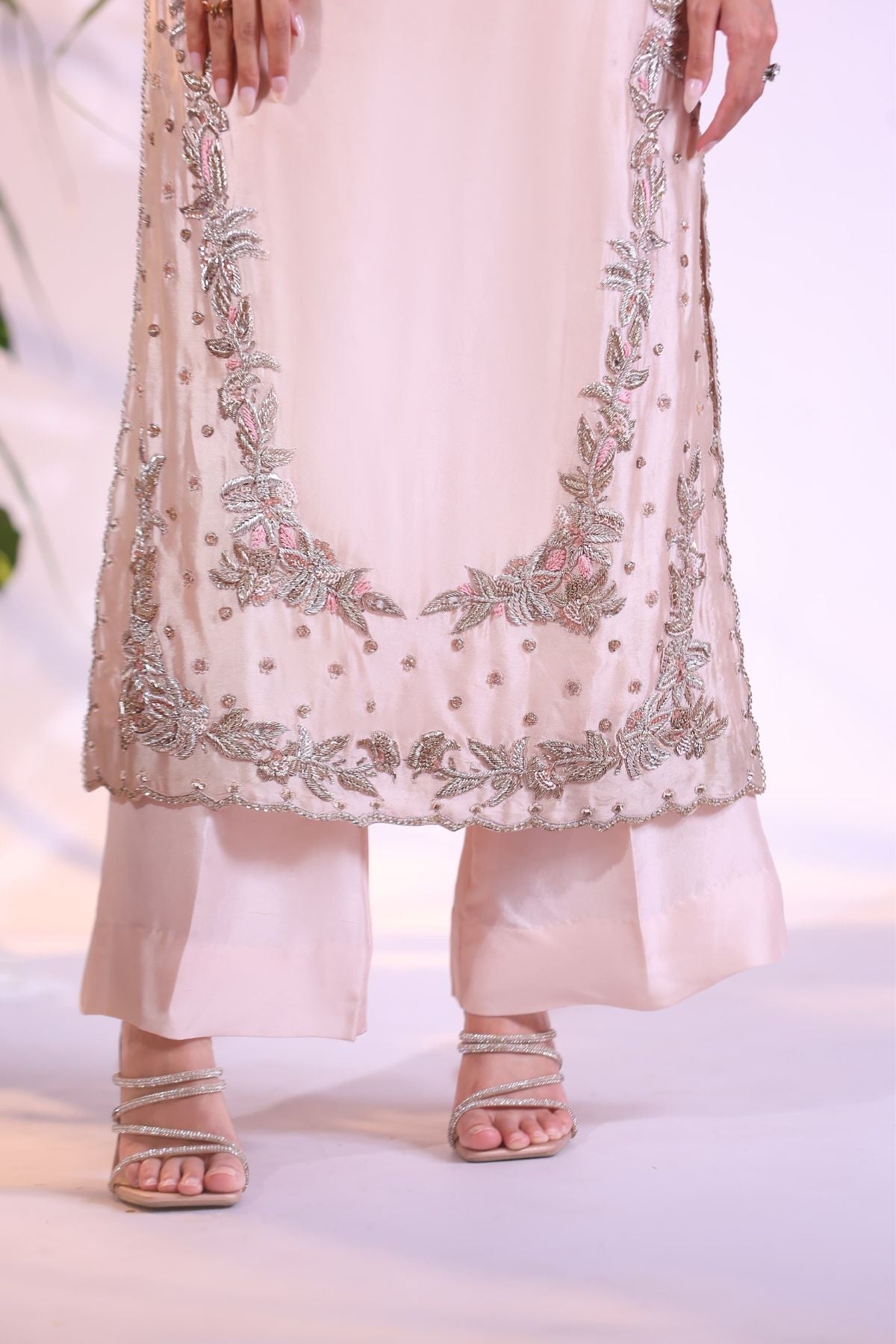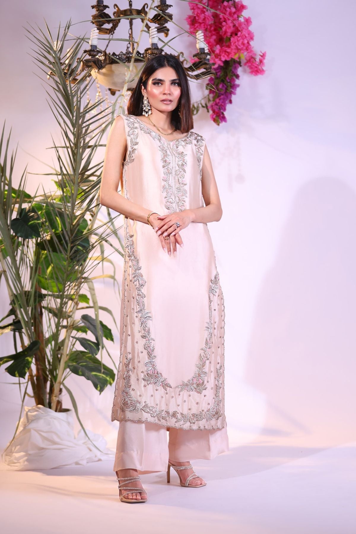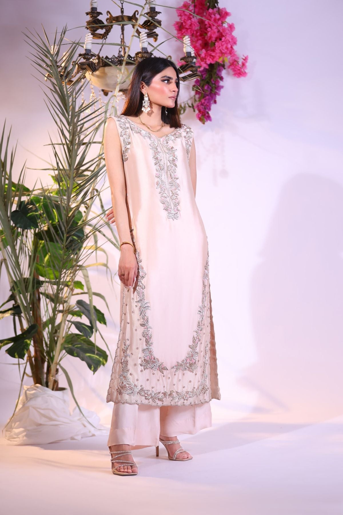 Exude understated luxury with this dreamy blush pink long shirt, designed in a sleeveless silhouette for effortless elegance. The front is adorned with delicate silver and pastel thread embroidery, gracefully framing the neckline and hem with soft floral vines and intricate detailing.