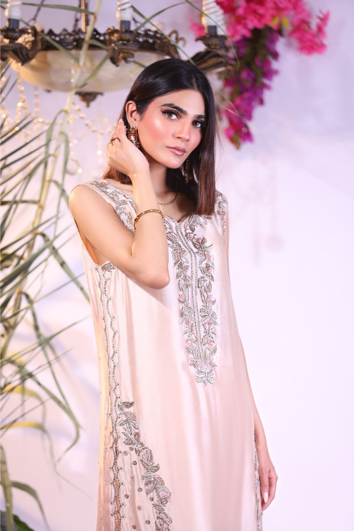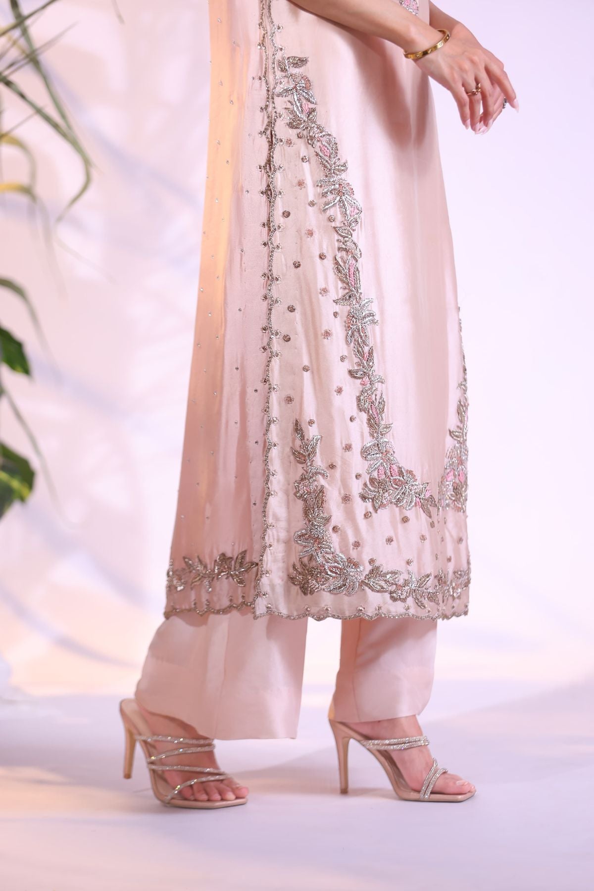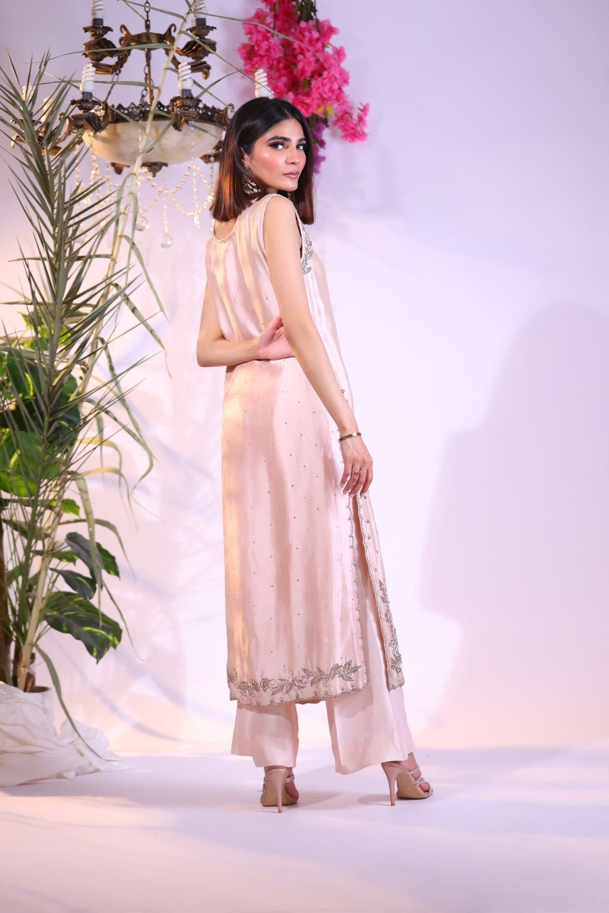 Exude understated luxury with this dreamy blush pink long shirt, designed in a sleeveless silhouette for effortless elegance. The front is adorned with delicate silver and pastel thread embroidery, gracefully framing the neckline and hem with soft floral vines and intricate detailing.