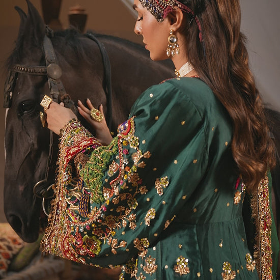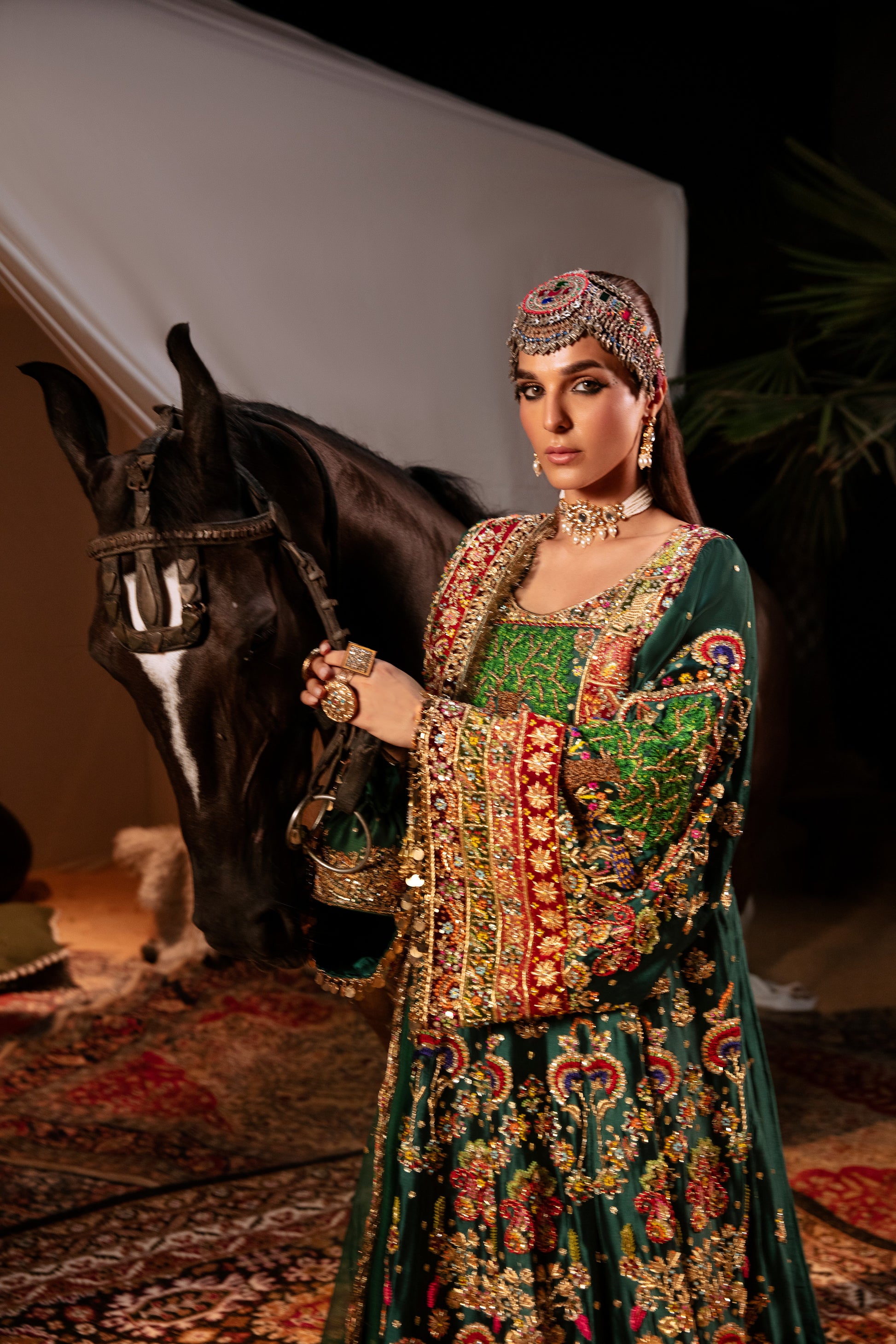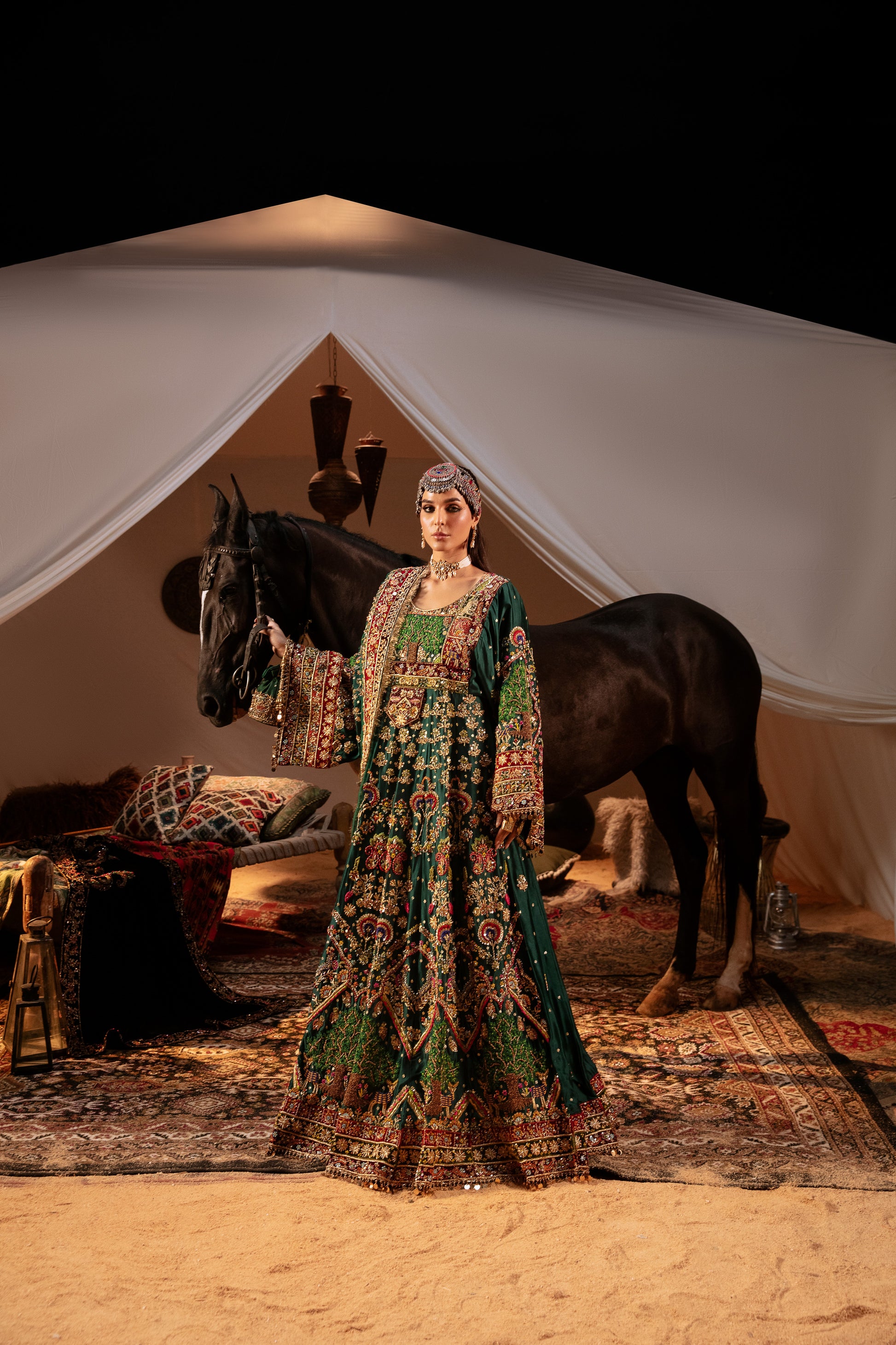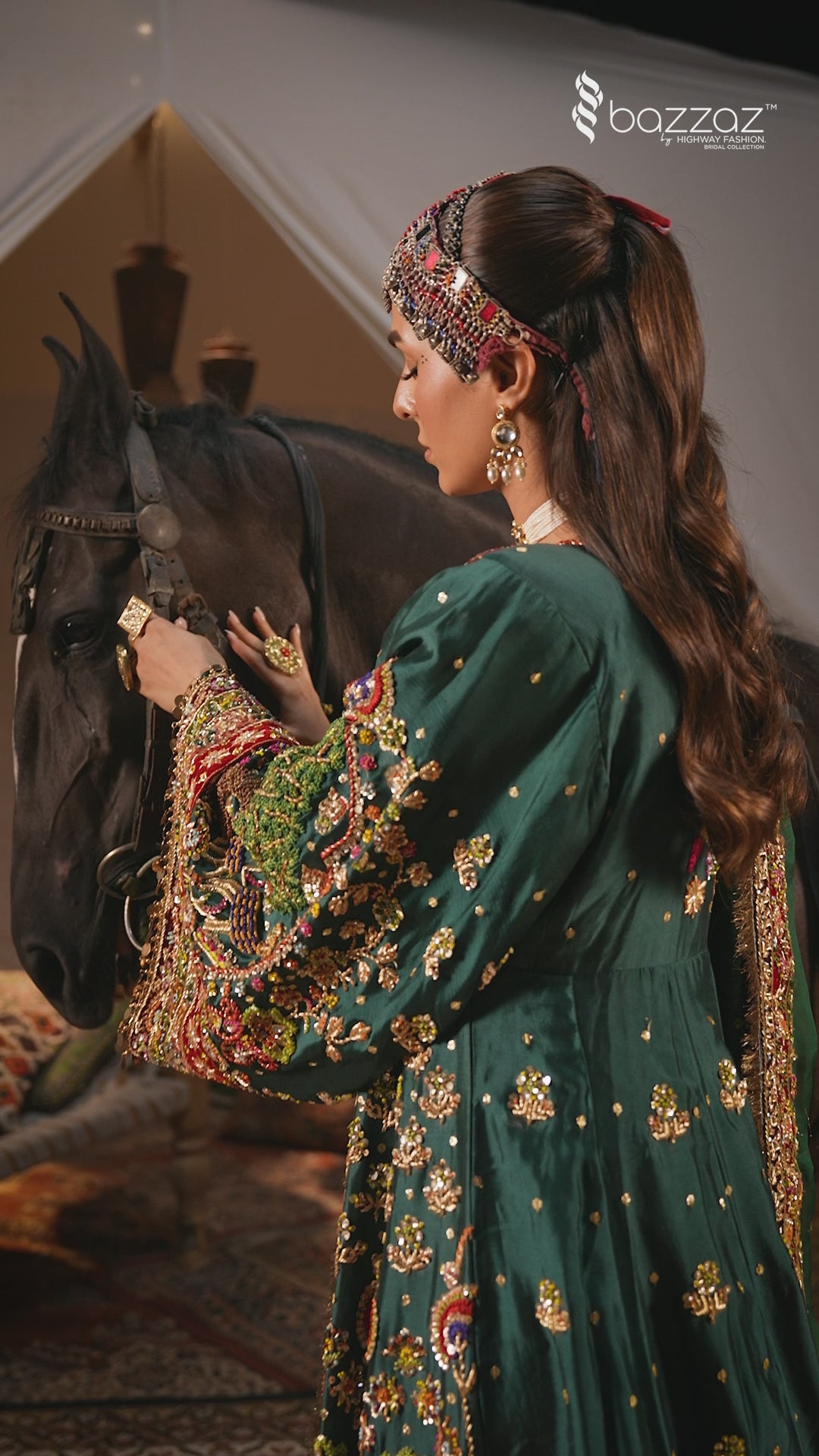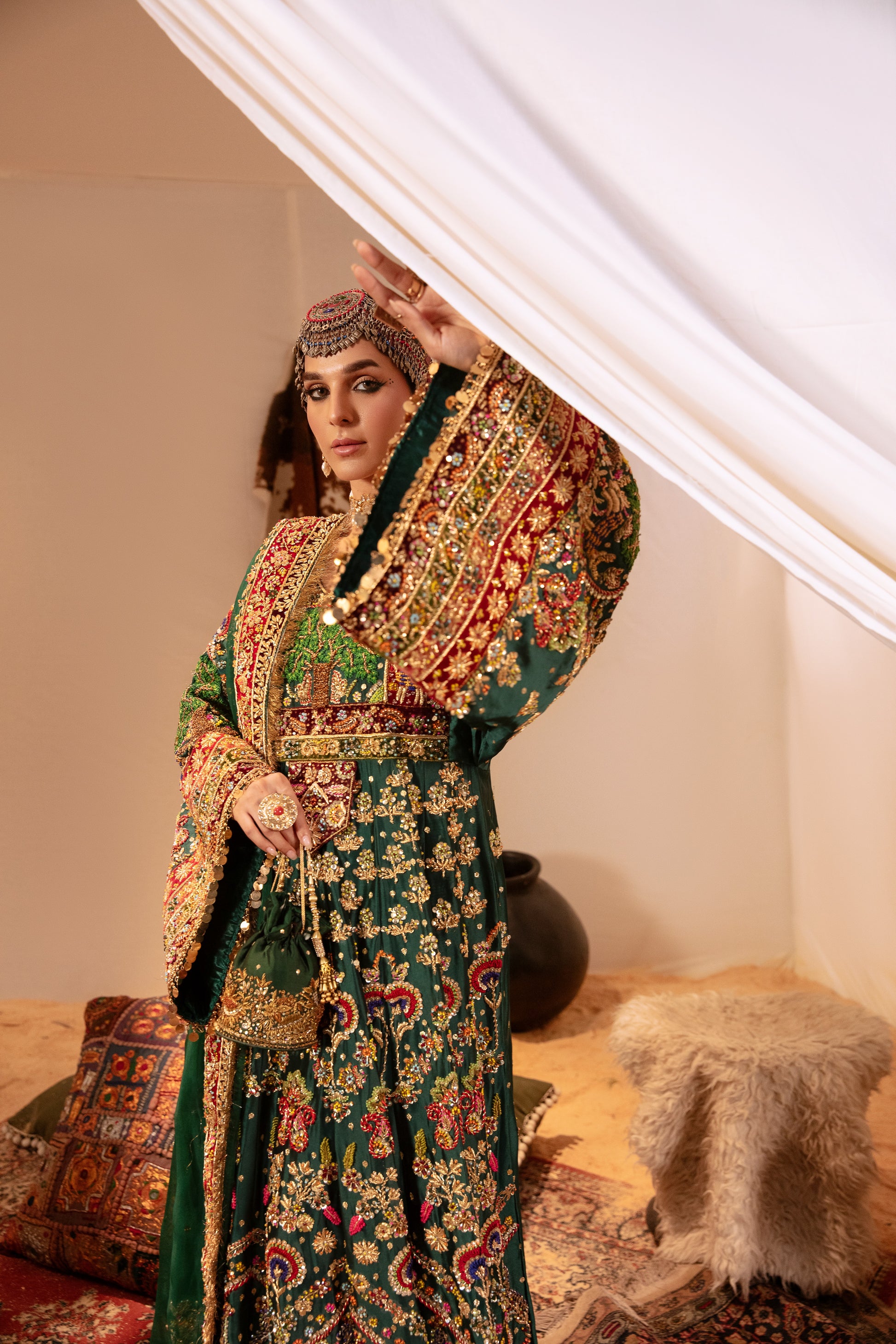 The Gul Meena ensemble from Bazzaz’s Daastaan Collection is a regal Afghani bridal dress crafted in a deep green Tasal silk frock with a plain silk trouser. The frock is adorned with fully handmade embroidery, featuring velvet zardozi, nakshi, dapka, sequins, crystals, diamantés, and resham detailing. A delicately bordered organza dupatta with velvet appliqué completes the look, while bell-bottom sleeves and tree-style embroidery add a touch of cultural authenticity. Perfect for brides seeking elegance rooted in Afghani tradition.