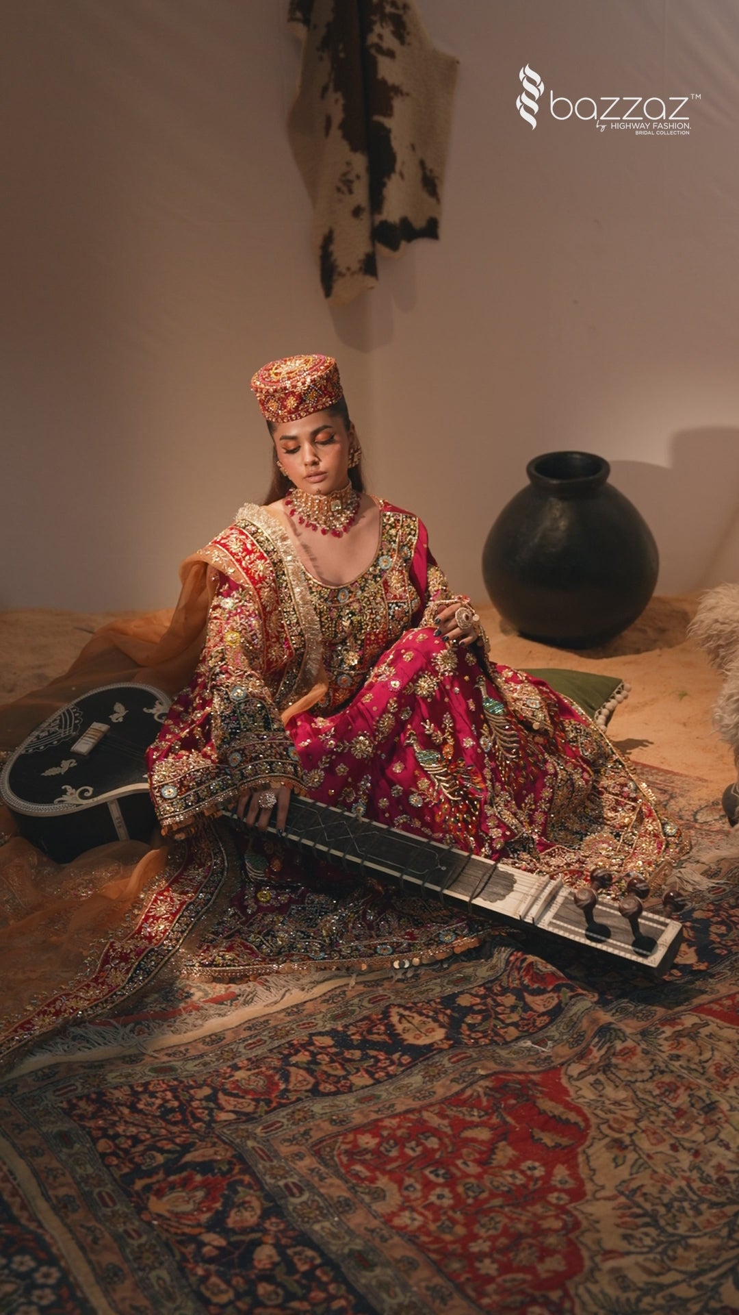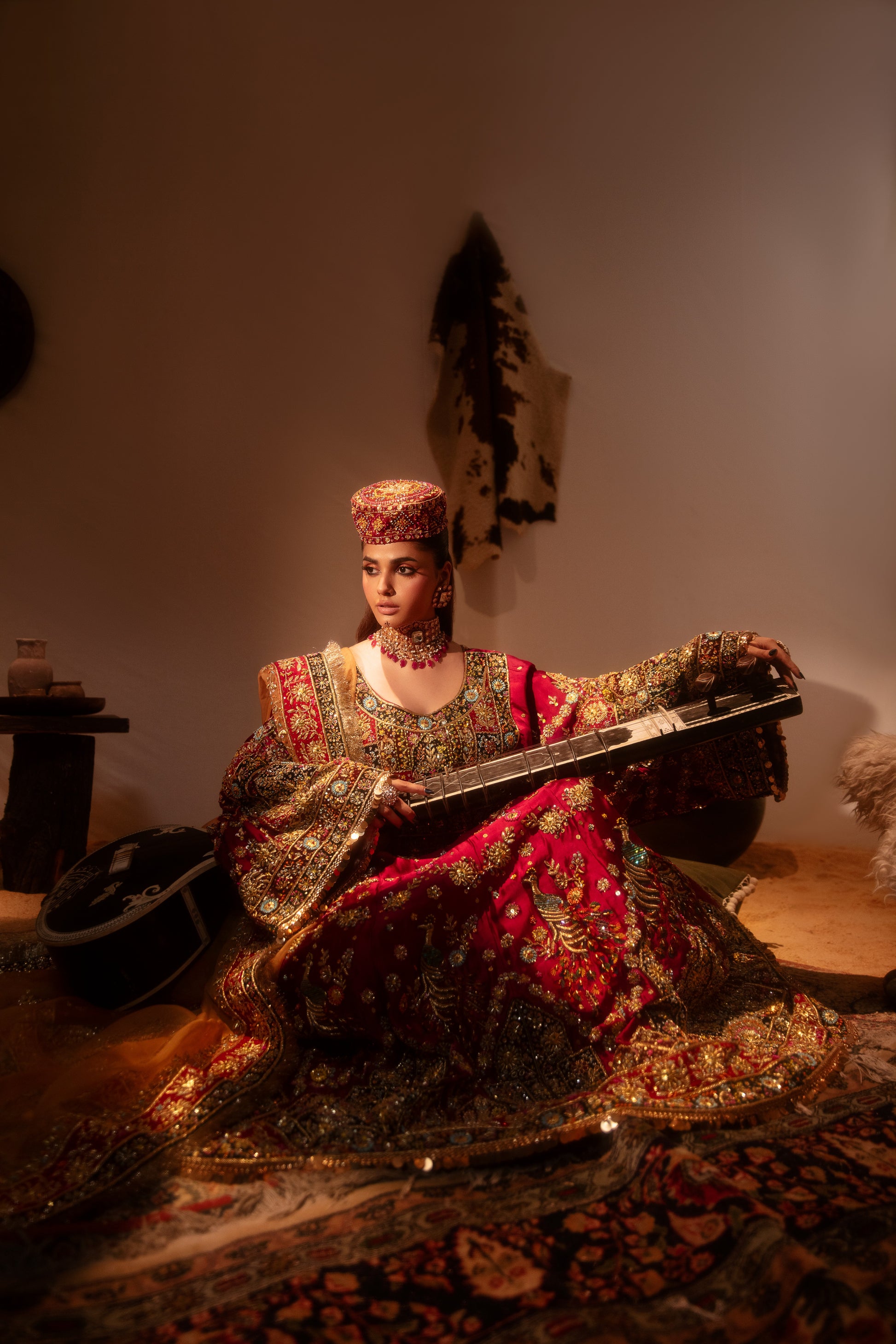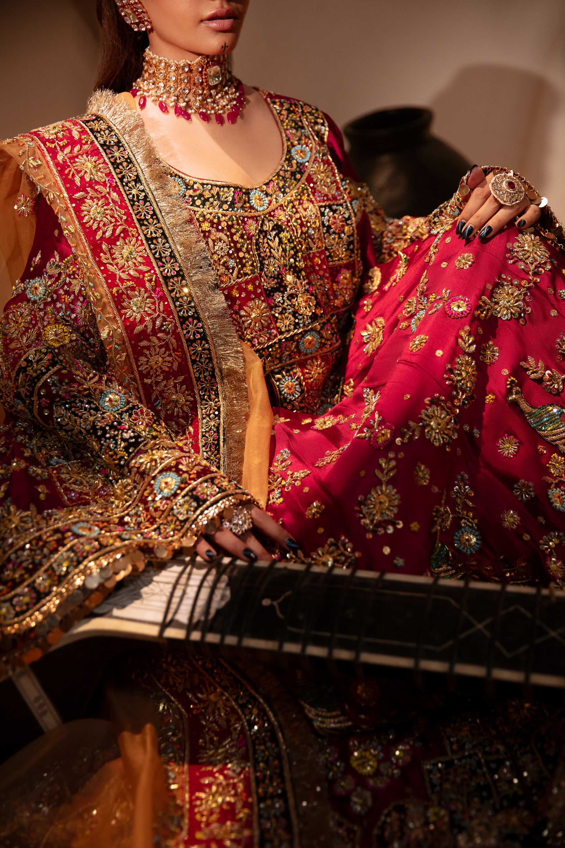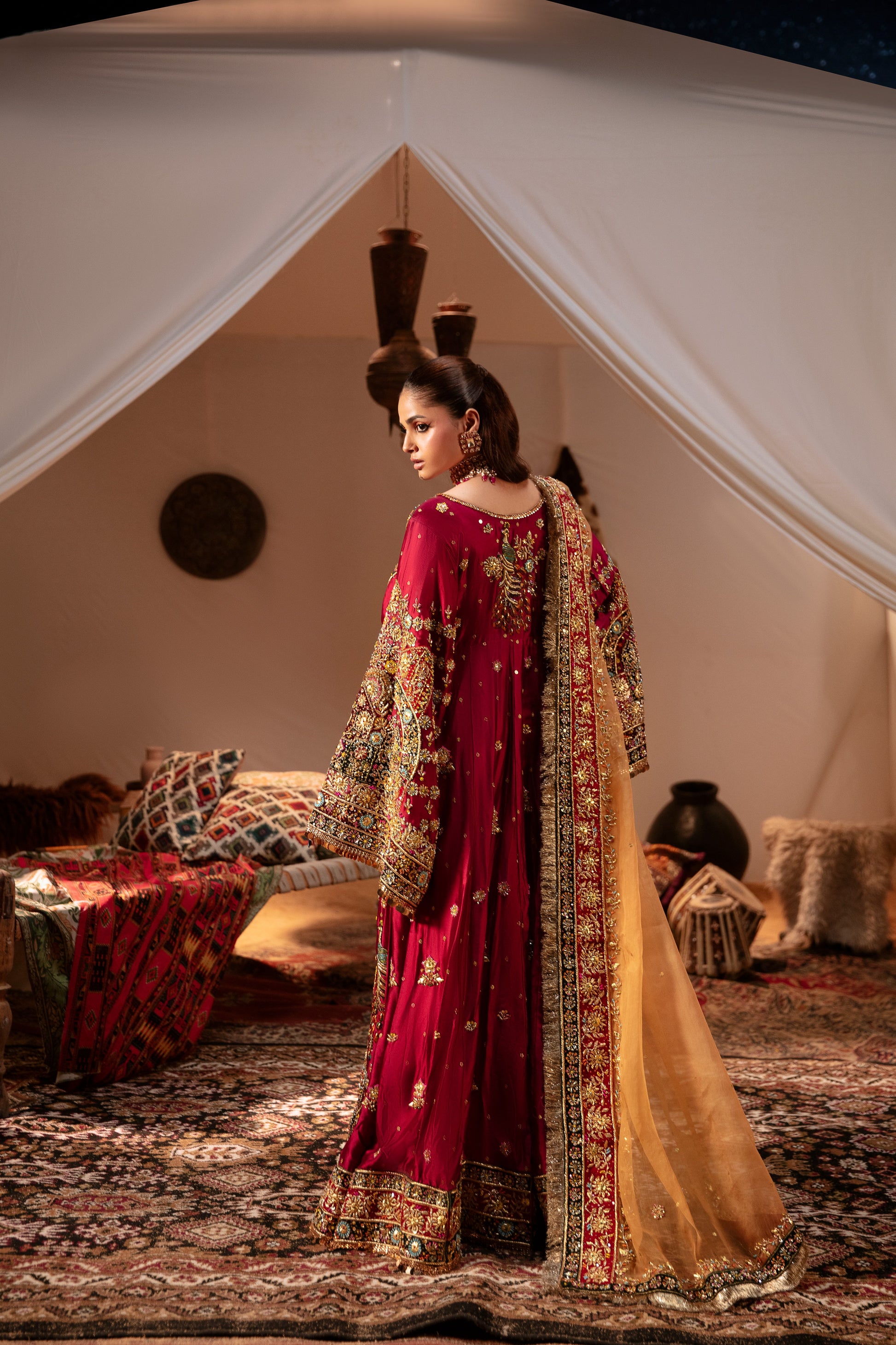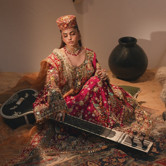 The Husn-E-Rabab ensemble from the Daastaan Collection embodies the richness of Afghani bridal tradition. Crafted in luxurious ruby red Tasal silk, the frock is designed with graceful bell-bottom sleeves and paired with a plain Tasal silk trouser. The vibrant orange organza dupatta, finished with a handmade velvet appliqué border, adds striking contrast and cultural depth. Intricate handwork featuring zardozi, nakshi, dapka, resham, crystals, sequins, and diamantés elevates this outfit into a true bridal heirloom. With its Afghani-inspired silhouette, Husn-E-Rabab is an ode to heritage, elegance, and timeless bridal beauty. Color: Ruby Red Dupatta
