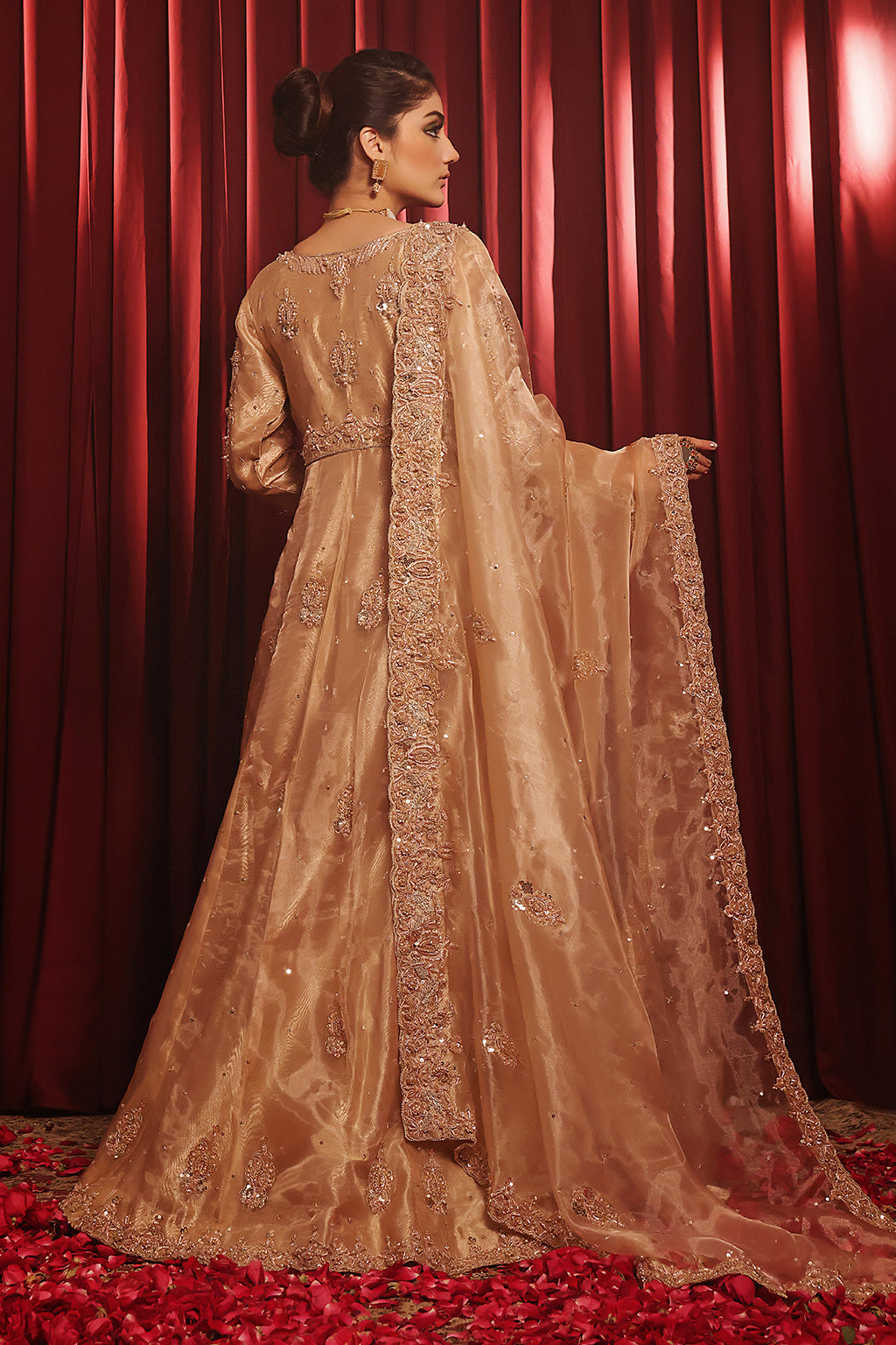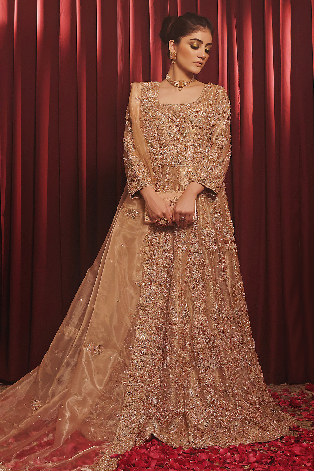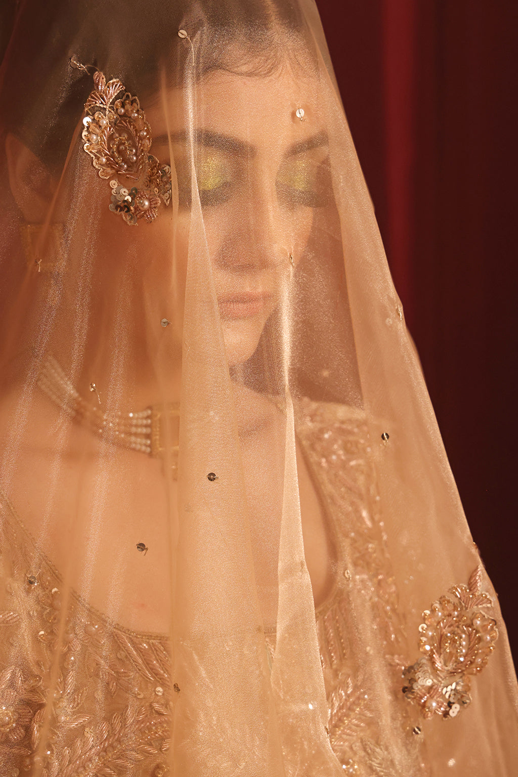 Rose gold maxi with elegantly worked motifs all over, scallop design at the border of the maxi and pearl detailing on the maxi. Paired with a subtle dupatta with fringe finishing, this bridal promises unimaginable perfection