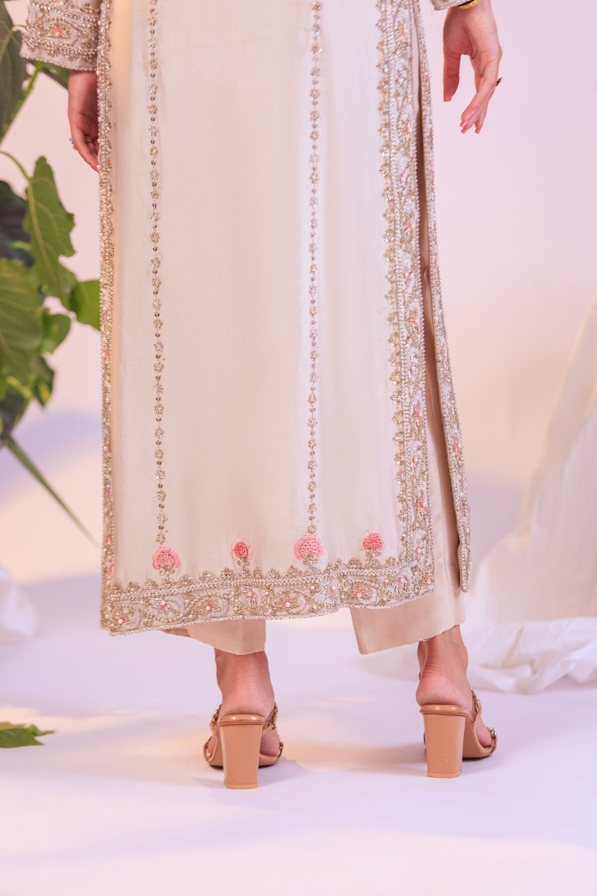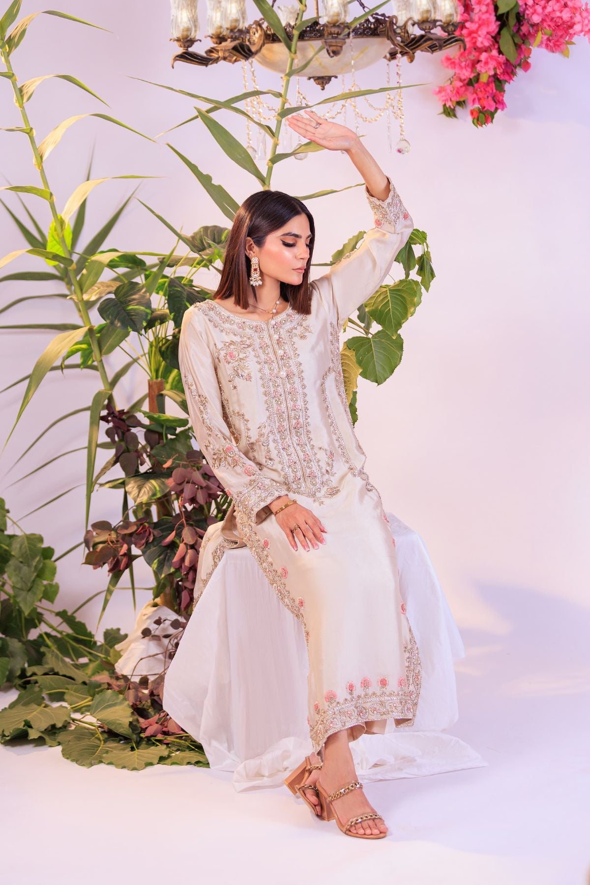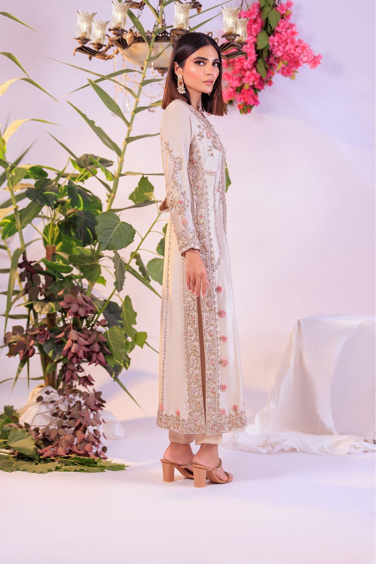 Radiate timeless charm in this exquisite ivory long shirt, delicately adorned with intricate embroidery in soft pinks and champagne gold threadwork. The neckline and sleeves are embellished with fine hand detailing, while the floral accents along the borders add a graceful feminine touch.