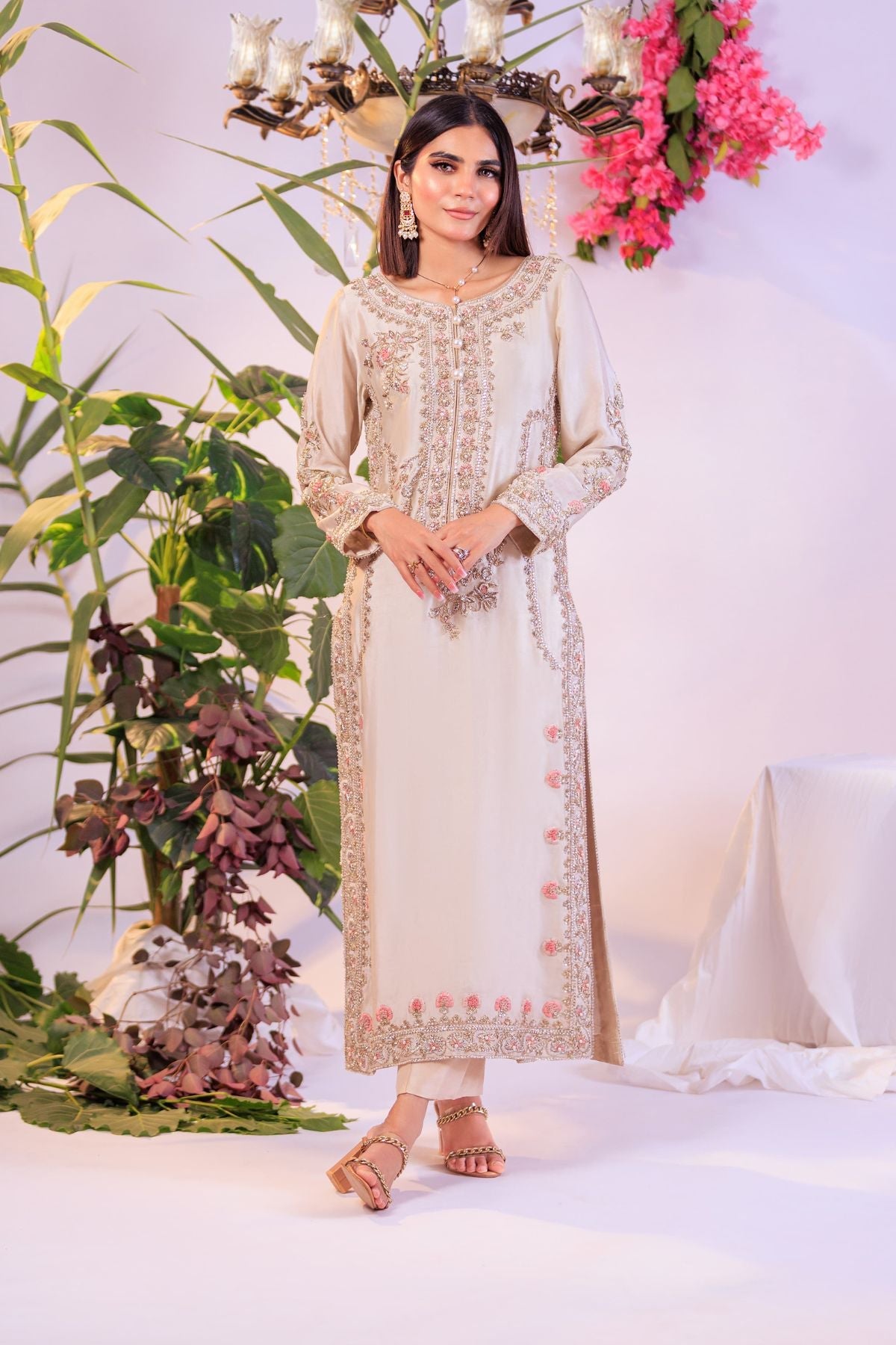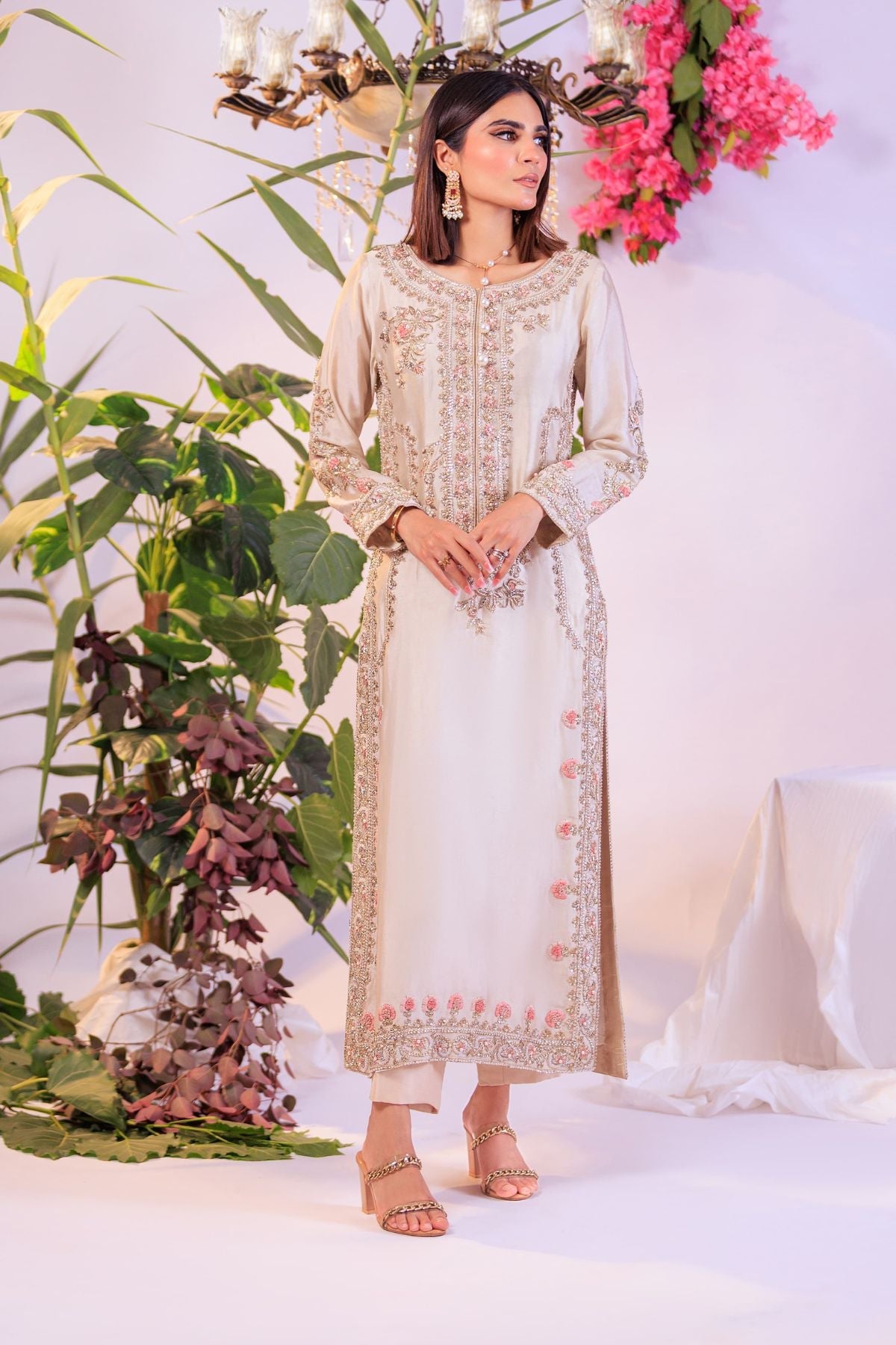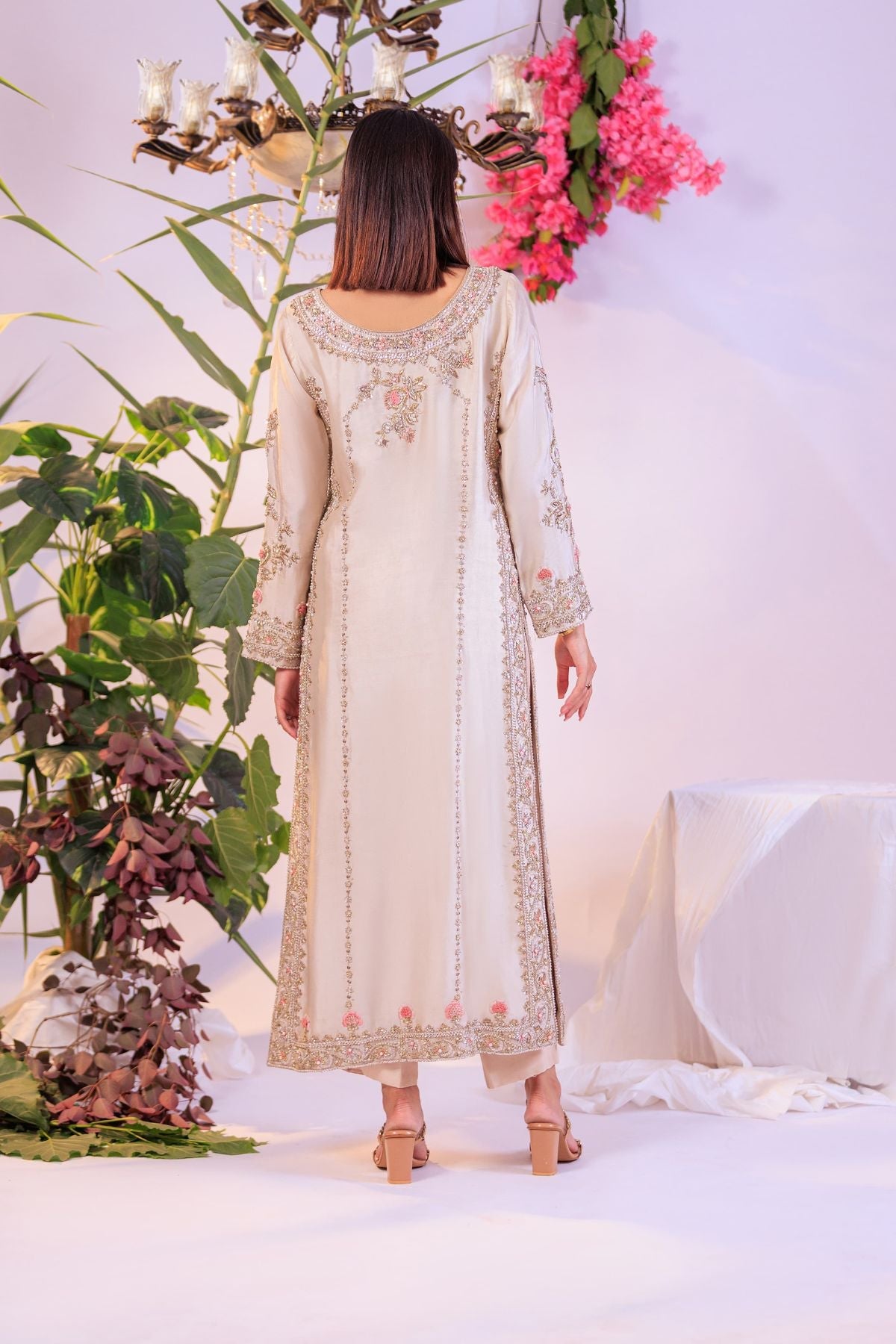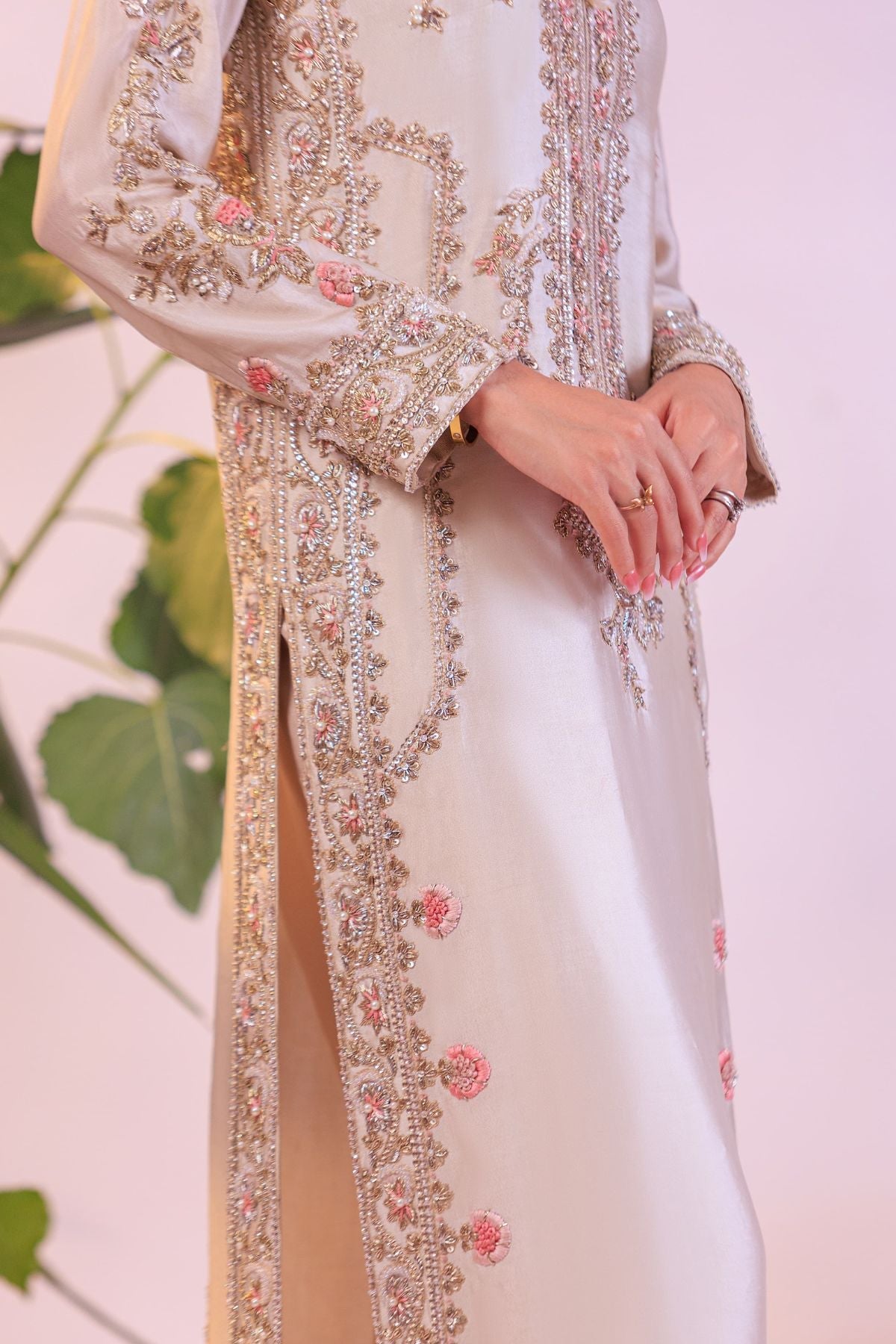Radiate timeless charm in this exquisite ivory long shirt, delicately adorned with intricate embroidery in soft pinks and champagne gold threadwork. The neckline and sleeves are embellished with fine hand detailing, while the floral accents along the borders add a graceful feminine touch.