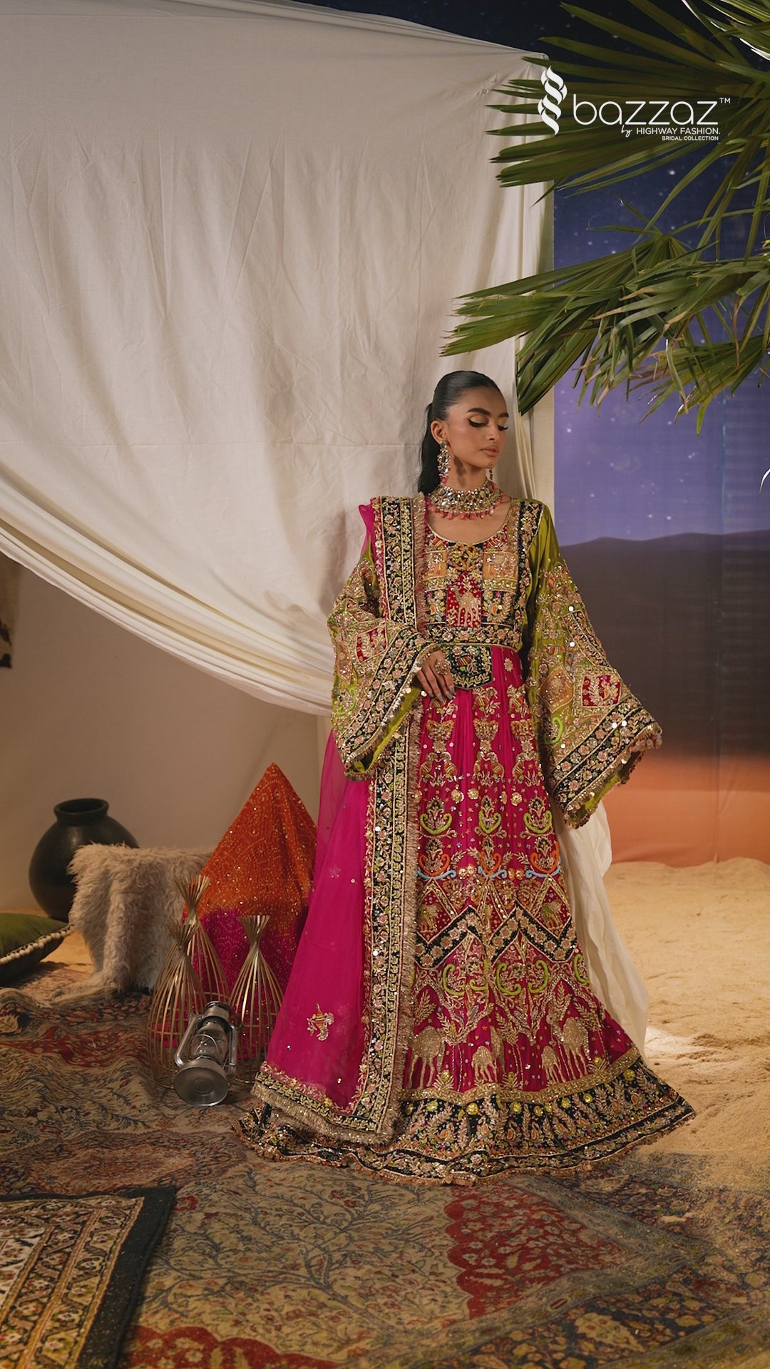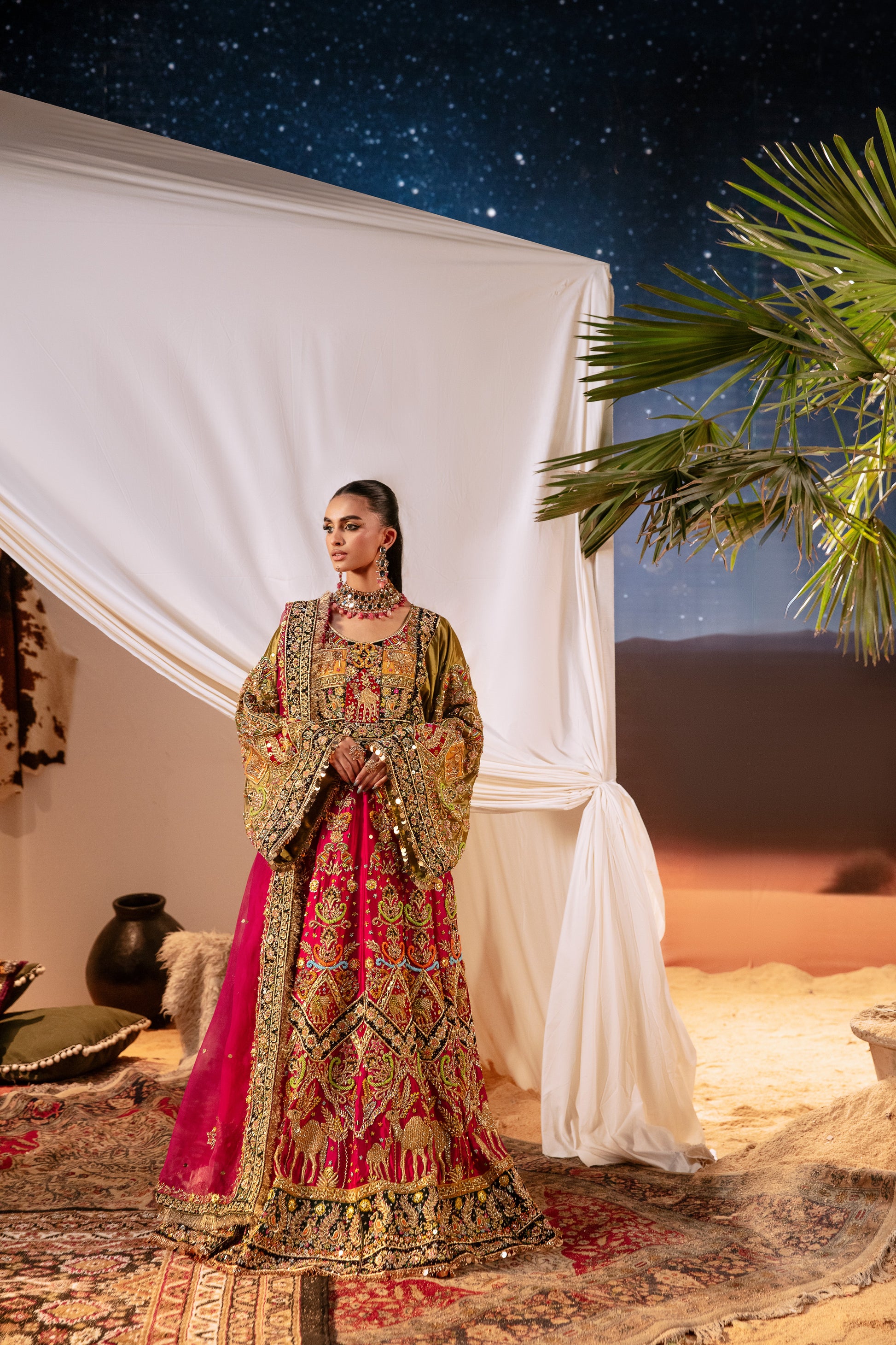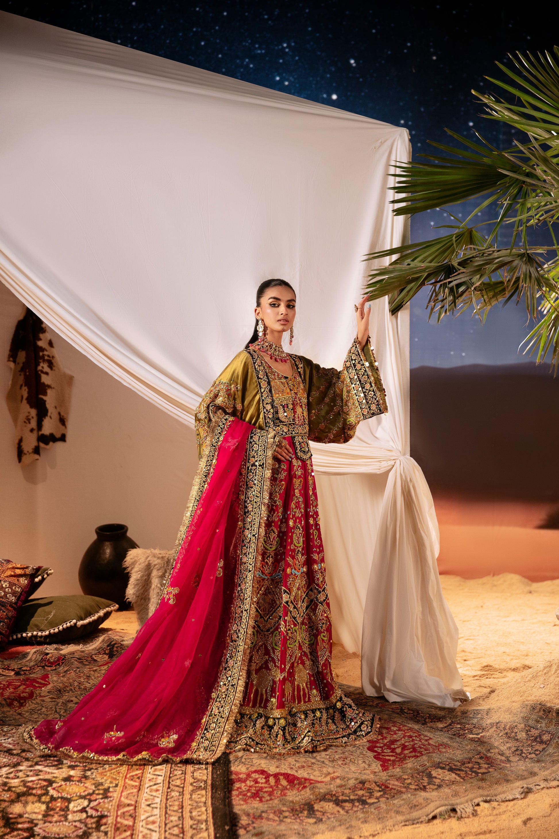 The Sahra Gul from Bazzaz’s Daastaan Collection is a breathtaking Afghani bridal dress that blends tradition with modern artistry. Designed in olive green tasal silk, the frock features bell-bottom sleeves and delicate, fully handmade embroidery with zardozi, nakshi, resham, crystals, dapka, sequins, and diamantés. The contrasting hot pink organza dupatta with a velvet appliqué border enhances its regal charm, while the plain tasal silk trouser balances the ensemble. Inspired by Afghani style and camel embroidery motifs, this dress is a perfect tribute to cultural heritage and bridal grace.