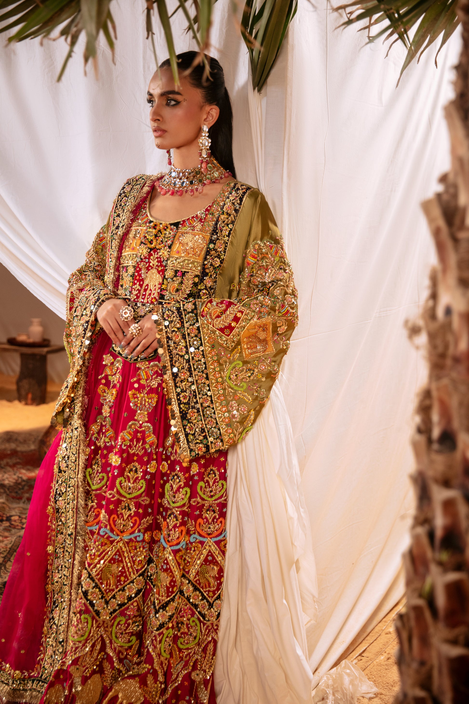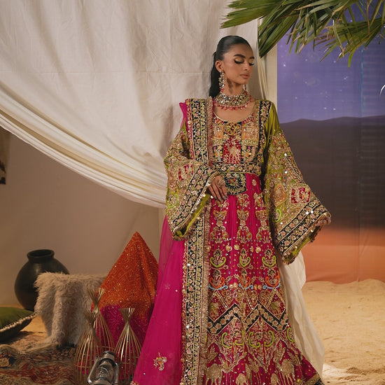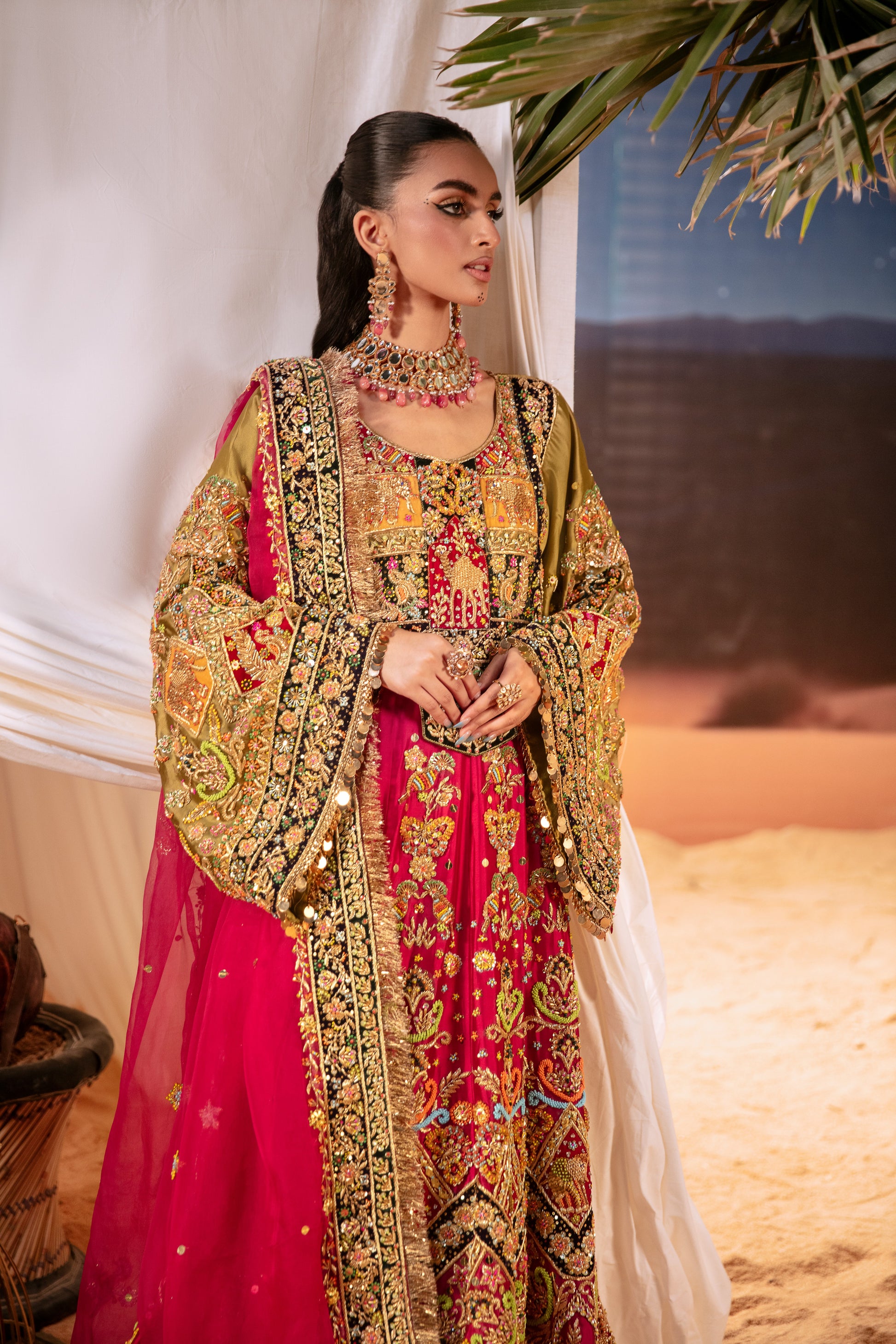 The Sahra Gul from Bazzaz’s Daastaan Collection is a breathtaking Afghani bridal dress that blends tradition with modern artistry. Designed in olive green tasal silk, the frock features bell-bottom sleeves and delicate, fully handmade embroidery with zardozi, nakshi, resham, crystals, dapka, sequins, and diamantés. The contrasting hot pink organza dupatta with a velvet appliqué border enhances its regal charm, while the plain tasal silk trouser balances the ensemble. Inspired by Afghani style and camel embroidery motifs, this dress is a perfect tribute to cultural heritage and bridal grace.