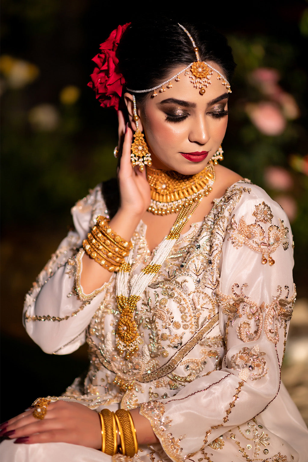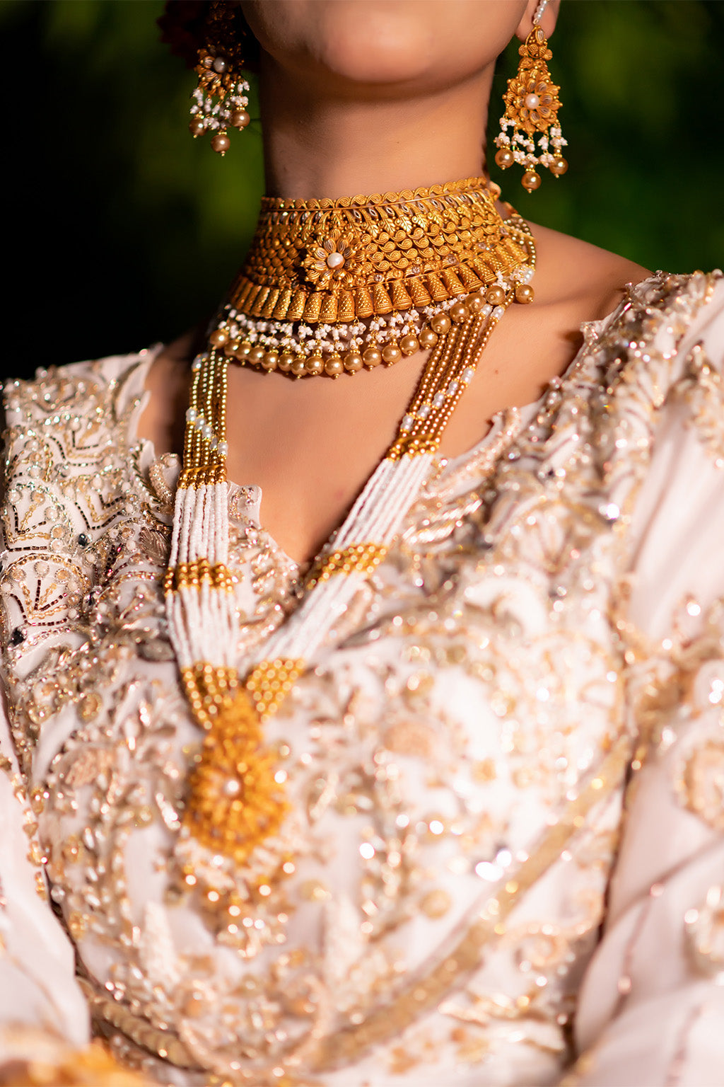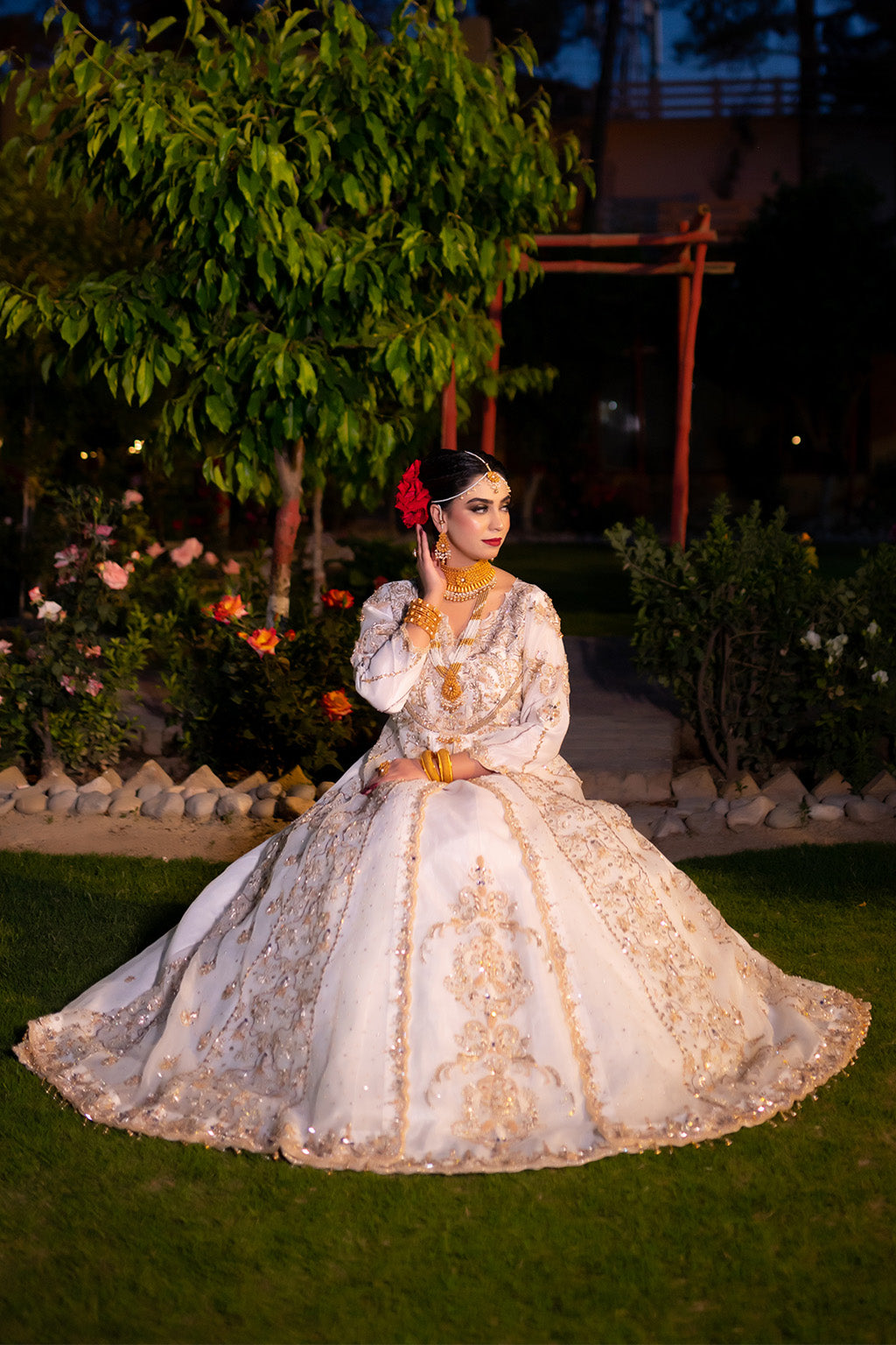 Discover Zarmina, an epitome of elegance and cultural heritage from Pakistan. This stunning bridal maxi is meticulously crafted from premium organza fabric, adorned with intricate sequin, zari, crystal, and resham embroidery. The detailed dapka work enhances its luxurious appeal, making it a perfect choice for brides who seek a blend of tradition and sophistication. Experience the beauty and artistry of Zarmina, designed to make your special day unforgettable.